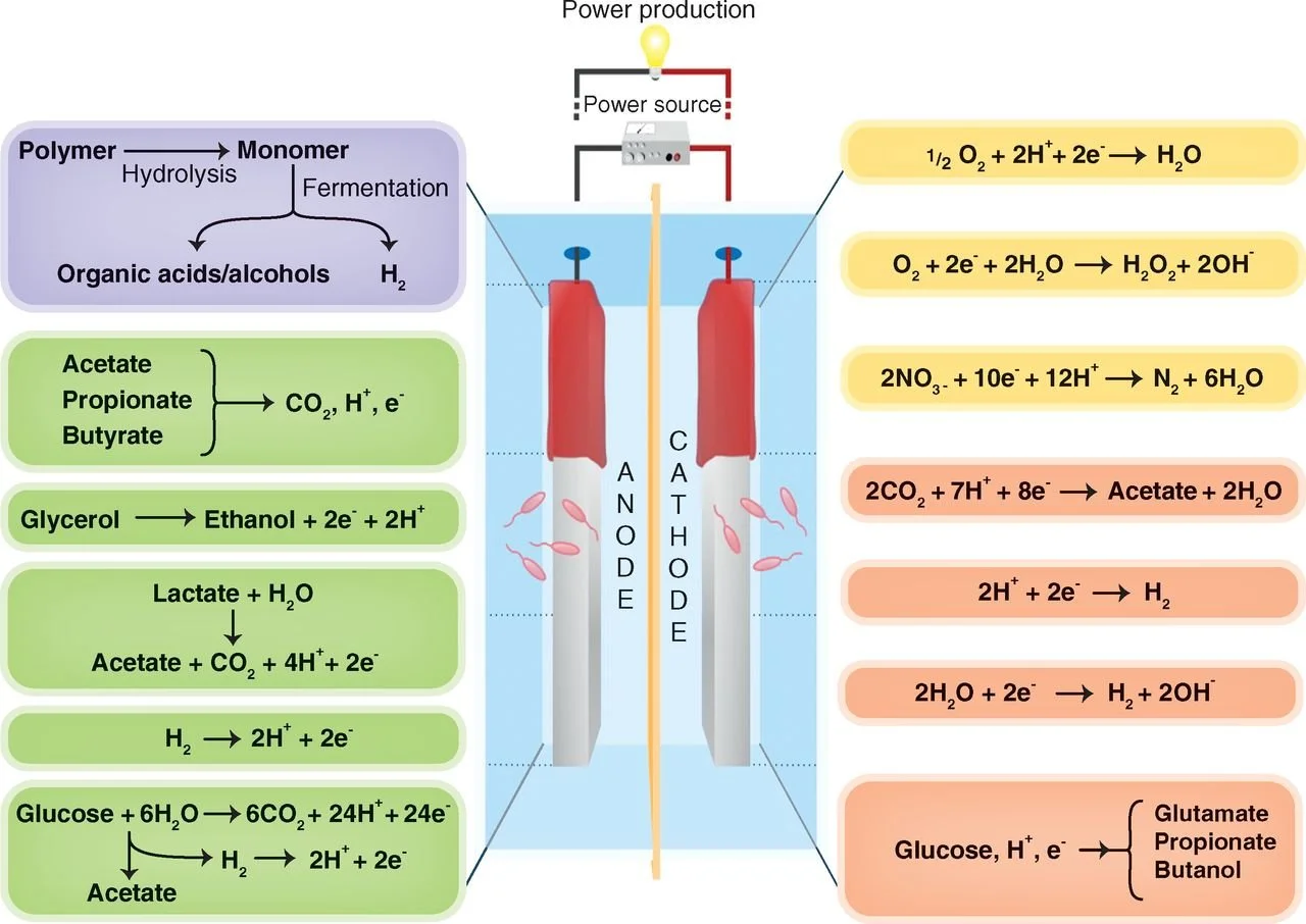 The unique abilities of electroactive microbes have inspired the development of microbial electrochemical technologies (METs), which use microbes as key components in devices that generate electricity, store energy, or produce valuable chemicals. In microbial fuel cells, bacteria that naturally transfer electrons to electrodes can generate electricity while simultaneously treating wastewater. In microbial electrosynthesis, microbes use incoming electrons to convert carbon dioxide into useful compounds like acetate or even bioplastics, offering a biological route to carbon capture and green chemistry.